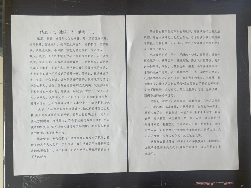 为进一步宣传贯彻党和国家的资助政策,教育引导学生受助思源、诚实守信的精神风貌,培育受助学生的文化底蕴和家国情怀,2023年5月30日—6月2日,化学工程学院组织开展学生资助诚信教育主题征文活动。活动通过文字讲述了身边的诚信、感恩故事,感情真挚、内容充实,体现出我院学子积极进取、诚信感恩、自强不息的精神面貌,表达了对国家资助政策的感激和对父母的感恩之情。