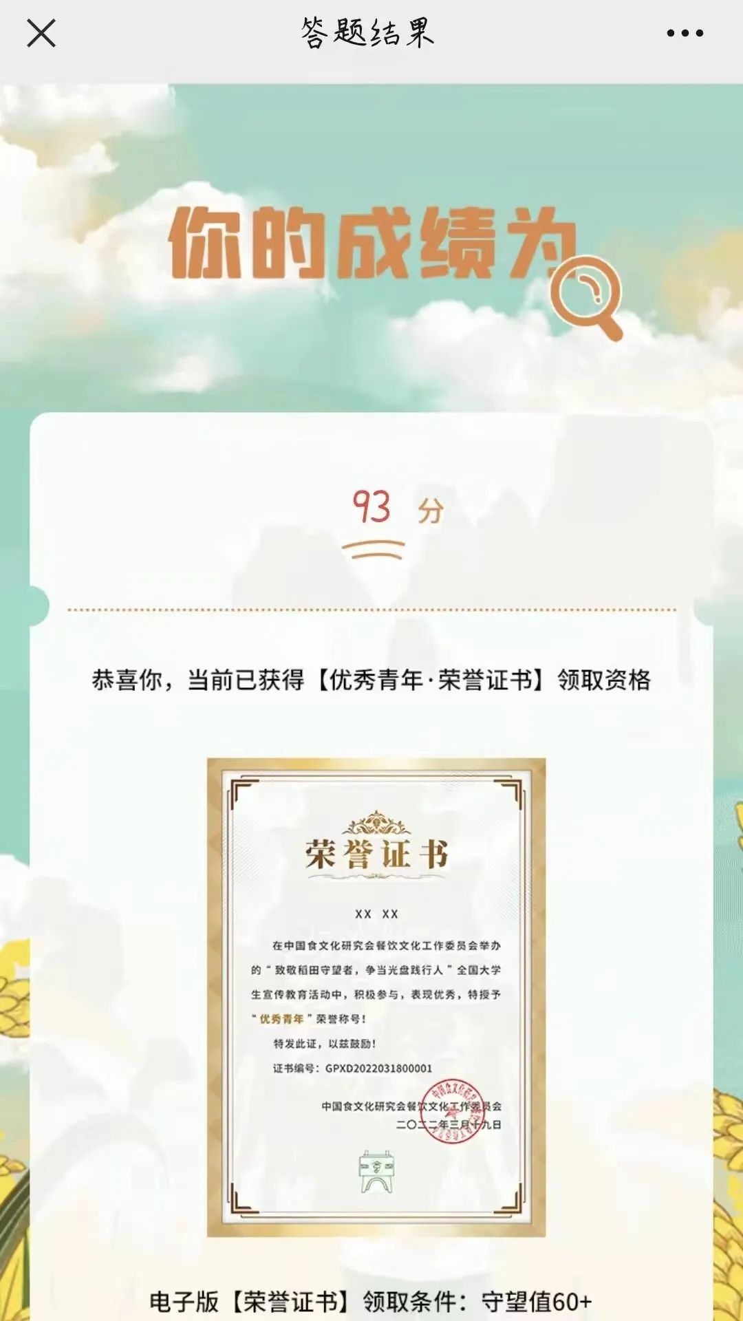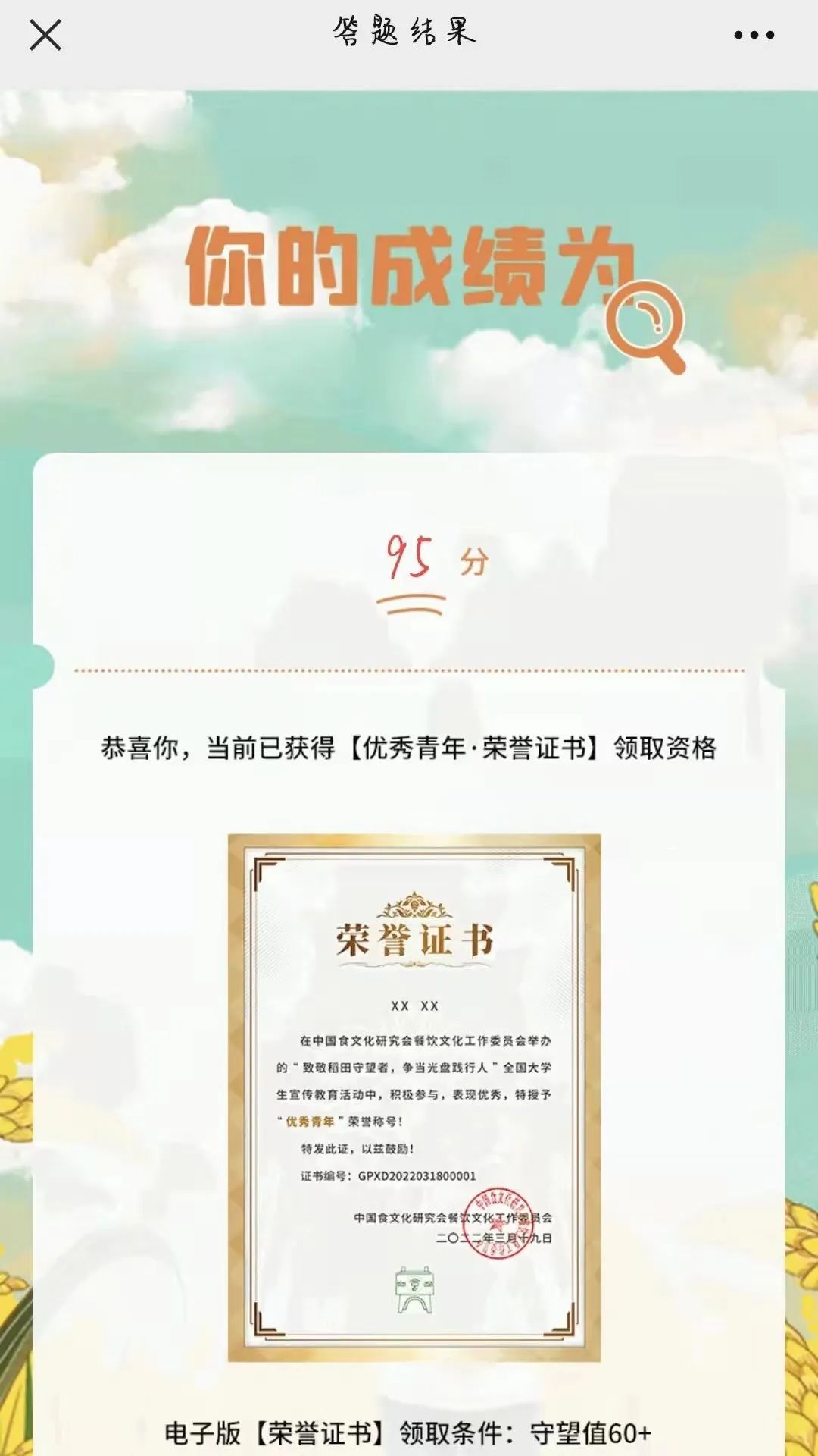 为加强同学们节约粮食,禁止浪费的思想理念。4月4日,我院组织学生开展了以“致敬稻田守望者,争当光盘践行人”为主题的线上志愿答卷活动,本次活动参与人员共计四百余人,由党总支副书记&团总支书记张雪组织参加。