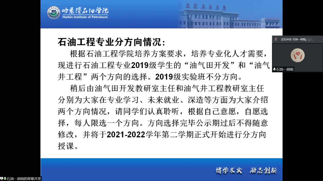 为确保2019级石油工程专业分方向工作顺利进行,让同学们更深入了解专业特点,我院于11月12日上午10:00在腾讯会议召开2019级石油工程专业分方向动员大会。院长李岳祥、油气田开发教研室主任王国库、油气井工程教研室主任杨昭及2019级石油工程系全体学生出席本次会议,会议由石油工程系主任胡旭主持。