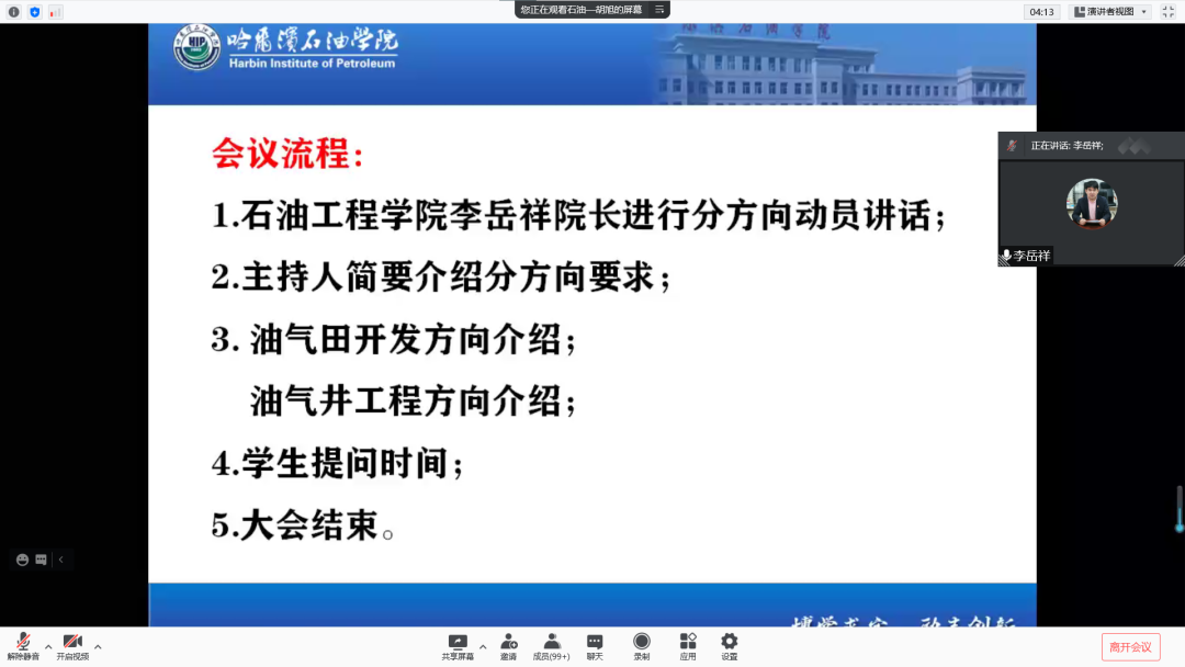 会议伊始,李院长进行动员讲话,他表示油气田开发和油气井工程两个专业相辅相成,都是国家建设与发展的基础性和紧缺性人才培养专业,没有哪个专业比哪个专业更好,但无论选择哪一个专业,都需要同学们不懈的努力,亲手创造出美好的未来。
