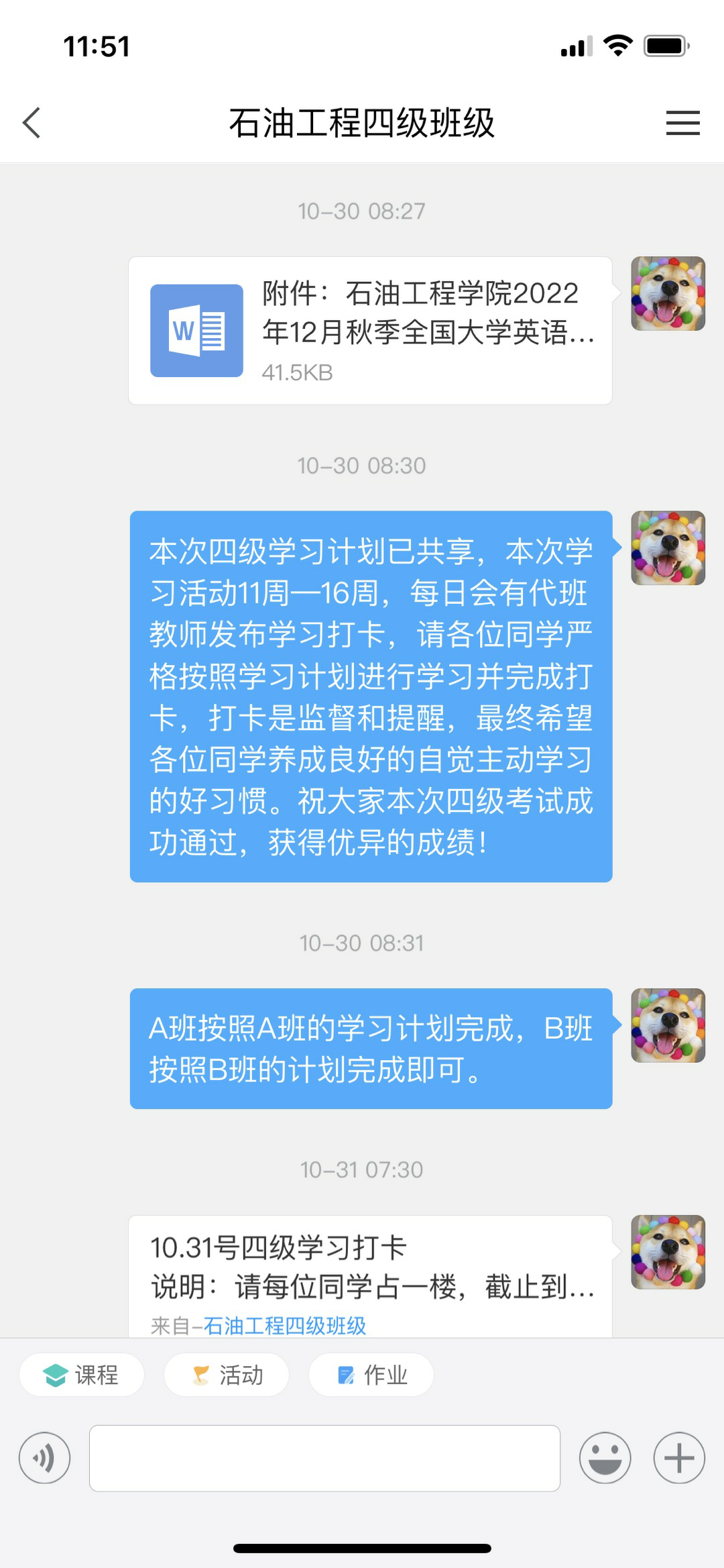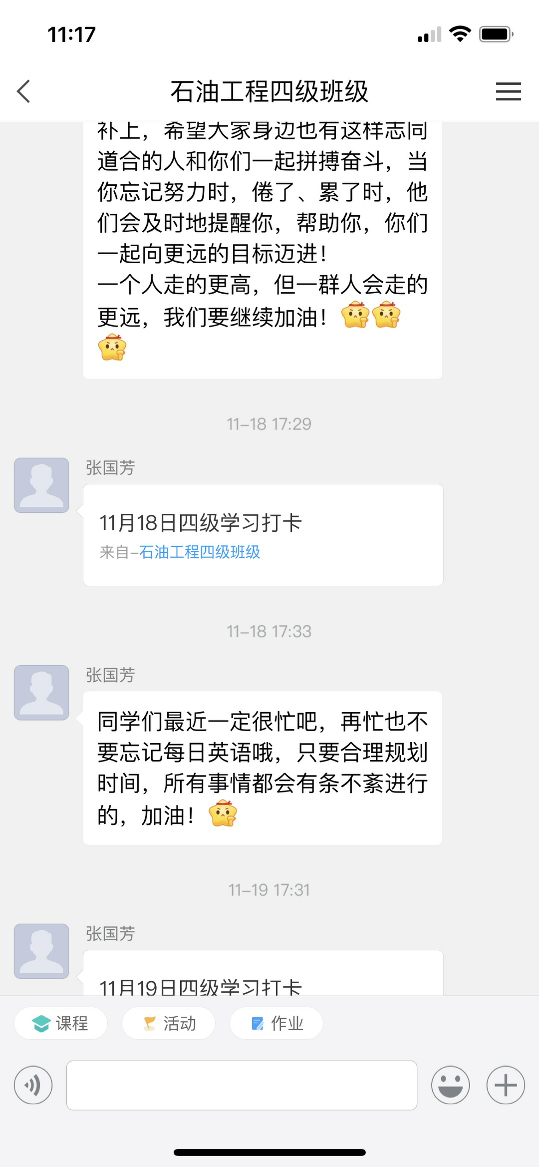 为更好学习贯彻二十大精神,落实以学生为中心的教育理念。从激发学生学习英语兴趣、增强学生学习英语信心、使学生充分备战国家四六级英语考试等角度出发,自10月底,石油工程系按照学院安排成立了英语四级学习班。该学习班由叶雪、李井洋老师为学生制定专门的四六级学习计划,学生自愿报名参加,各级辅导员老师宣传并成立班级,石油工程系教师负责监督指导,利用APP进行线上统一管理的形式进行。班级学生需按时完成学习计划中的学习任务,并在学习完毕后及时线上打卡;每周委派一名教师负责班级监督与管理总结工作,并随时为学生解答学习英语和备战四六级考试过程中的各种问题。