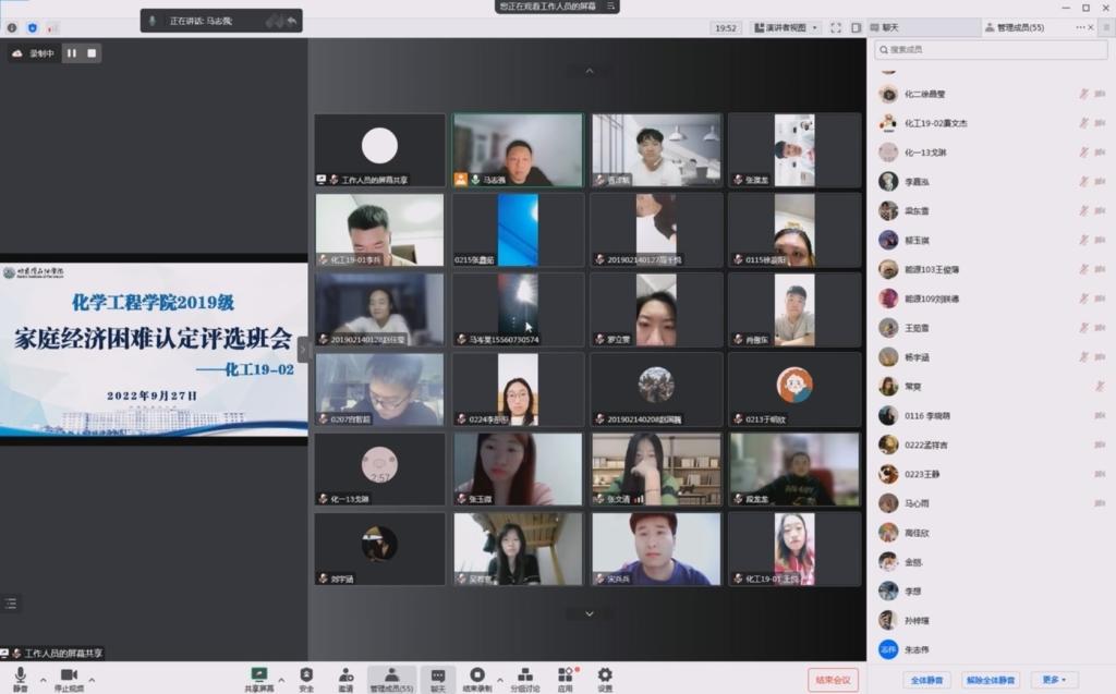 为深入贯彻落实党和国家的资助政策,保证国家对学校家庭经济困难学生的资助政策落到实处,同时开展企业实习安全教育工作,2022年9月27-29日,化学工程学院2019级召开第三次主题班会——家庭经济困难认定通知及实习安全,会议由辅导员马志强主讲,2019级学生分不同场次参加会议。