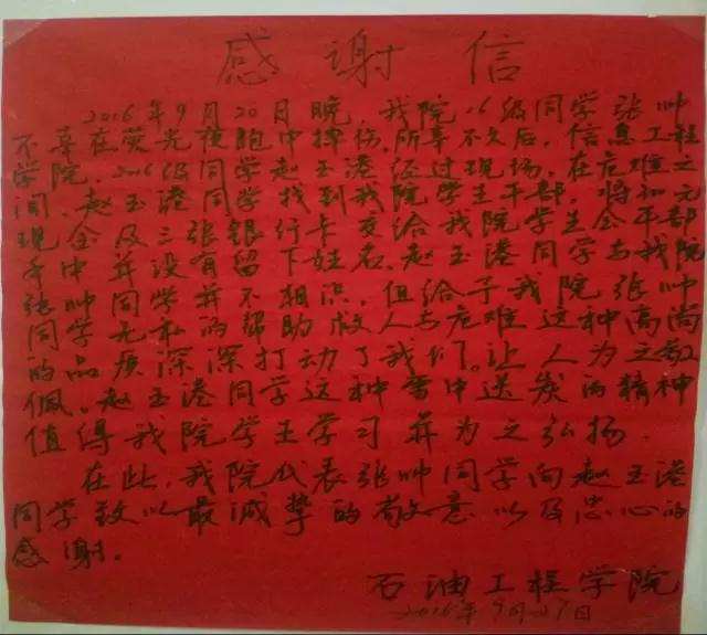 因为当时,我明明知道自己带了足够那个同学需要的钱,就算是校外毫不认识的陌生人还会帮一把,更何况他就是我同校的兄弟呢。当自己去吃饭,刷饭卡的时候,用小沈阳的话说 那卡里就剩点利息了,自己才知道,应该留下一百,解决一下 自己的问题;可能是做了好事,好报很快就在我身上发生了——我用了寝室室友两天的饭卡。当事后导员通知我取银行卡和石油同学找到我,书记导员都对我提出表扬。没有辅导员对我的肯定,觉得这件事值得让其他人学习,自己也获得不了这么大的荣誉。