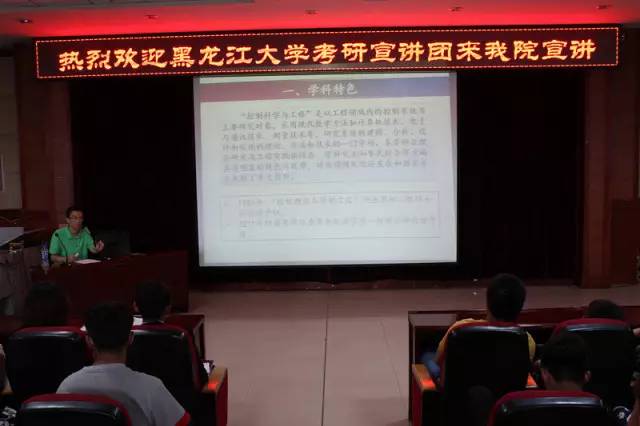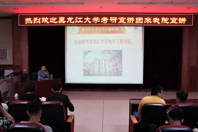 首先,吴文智教授就黑龙江大学电子信息工程学院历史沿革、学院师资情况、学院专业布局、学科发展现状、专业招生格局、专业招生政策等7个方面做了具体全面的分析。其次,王欣教授针对电子信息工程学院一级学科控制科学与工程做了更加细致的讲解。两位教授以己为例,切身为同学们阐述考研问题的方方面面,以此来引导同学们树立正确的人生观、价值观,切实加强对考研问题的关注。两位教授的耐心讲解,使在场的同学对黑龙江大学电子信息工程学院的有了较为细致的了解,并极大的激发了学生的考研热情,让在场同学对于考研有了较为深刻的认识。