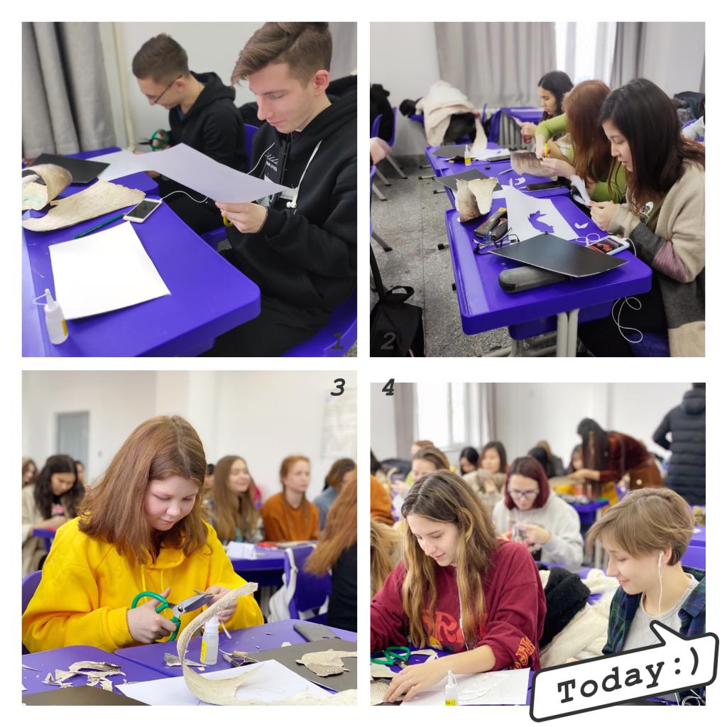 留学生看着这些仿若大自然鬼斧神工的作品,尤其是由鱼皮拼接而成的彩色花鸟图,让在场的许多学生大为惊叹,纷纷讨论并开始制作鱼皮画。