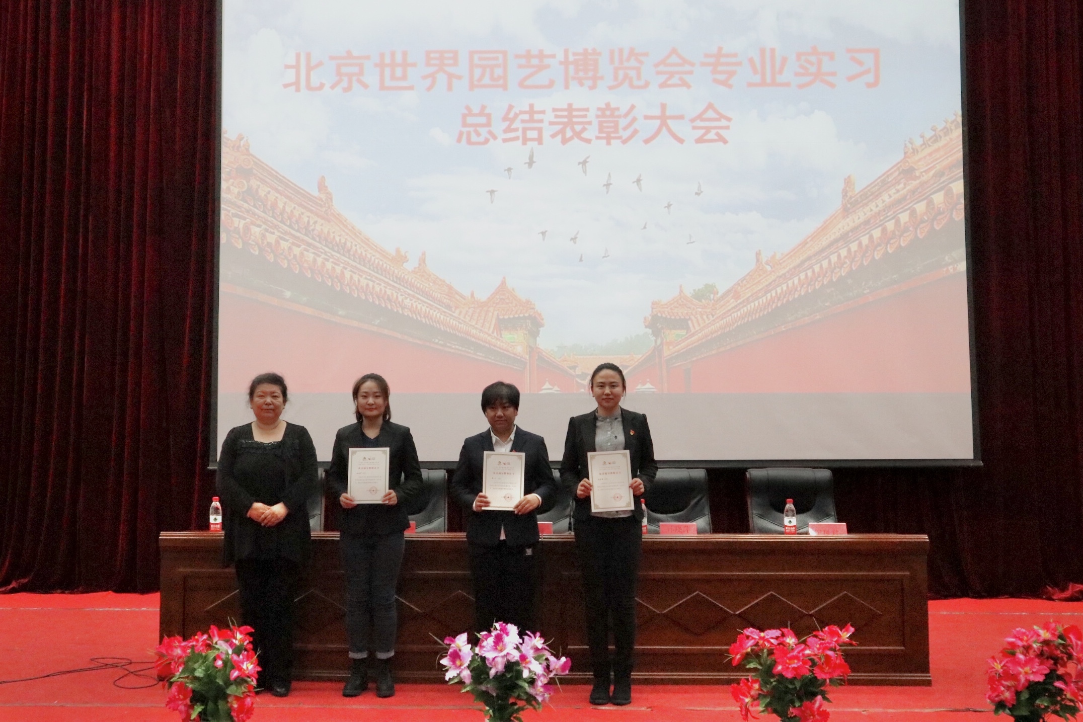 在实习中,邹丹老师全程指导学生在北京世园会工作期间的课程学习和工作,孙晓萍和赵连琦两位老师负责学生的生活管理并多次到北京指导学生实习,世园会向三位老师授予了优秀指导教师的荣誉称号,以表彰三位老师的贡献。