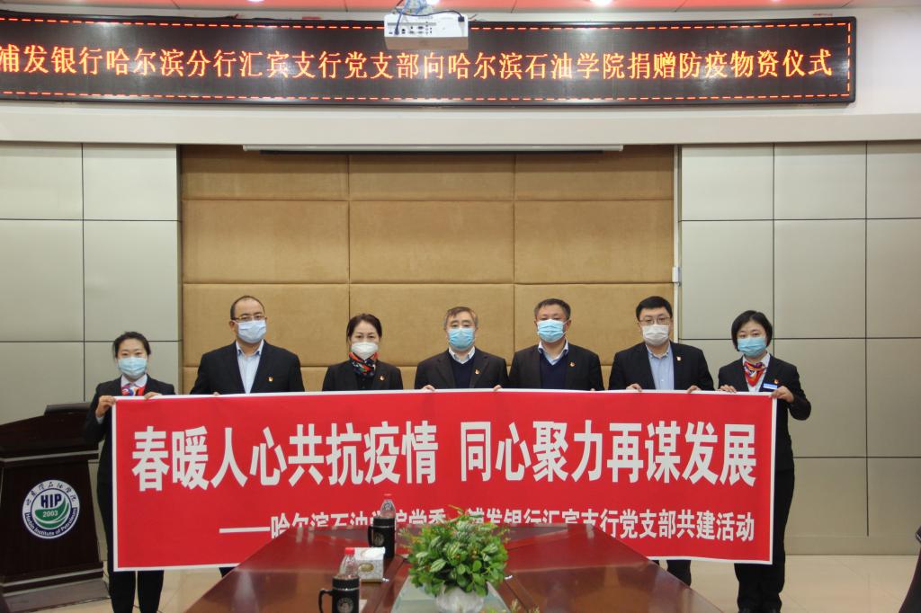 党委书记焦光纯对浦发银行哈尔滨分行汇宾支行党支部的关怀和帮助致以诚挚的谢意和崇高的敬意。焦书记表示,雷竞技raybet官网版下载与浦发银行哈尔滨分行汇宾支行之间一直联系紧密、情感深厚。此次捐赠更加彰显校企关怀,学校将严格管理捐赠的抗疫物资,物尽其用,全部用于校园防疫抗疫,全力做好校园疫情防控各项工作。