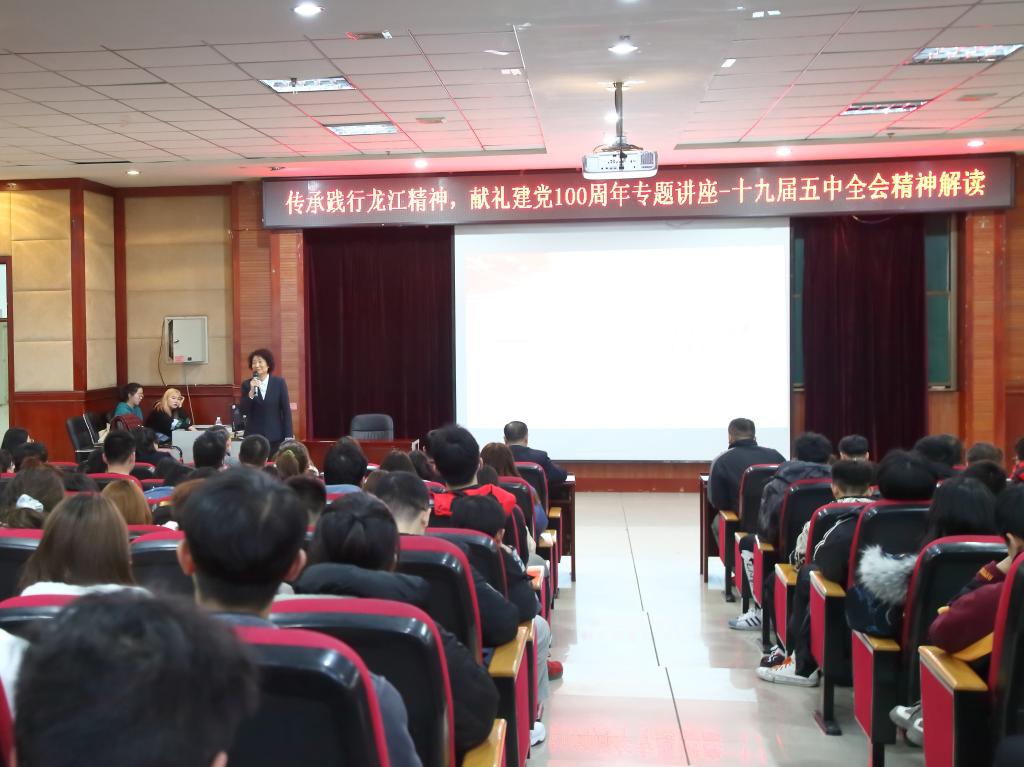 11月3日,雷竞技官网举办传承践行龙江精神,献礼建党100周年专题讲座——十九届五中全会公报解读,马克思主义学院院长宋玉玲教授作专题辅导报告。学校党委组织部、宣传统战部全体人员、马克思主义学院全体教师,及各党总支书记、副书记、党支部书记、学生代表等近300人现场聆听报告。讲座由学校党委宣传统战部部长康平军主持,党委书记焦光纯作讲话。