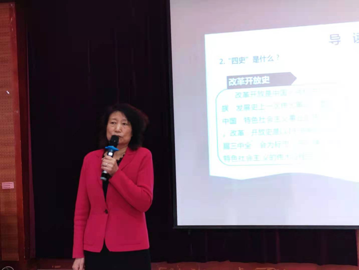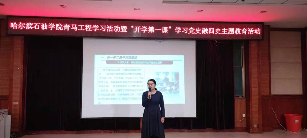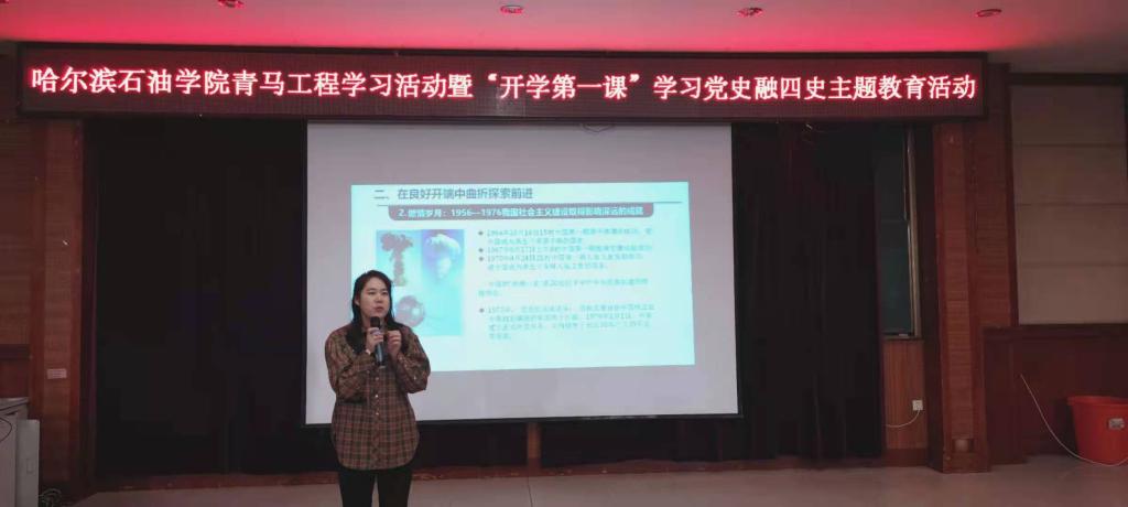 此次主题教育活动由马克思主义学院院长宋玉玲教授担任主讲教师,她指出学好“四史”,培根铸魂。作为青年人的我们要更加认真学习四史的成功经验,“传承红色基因,致敬建党百年”早日成为中国特色社会主义的合格接班人,为祖国繁荣发展贡献出自己的青春力量。