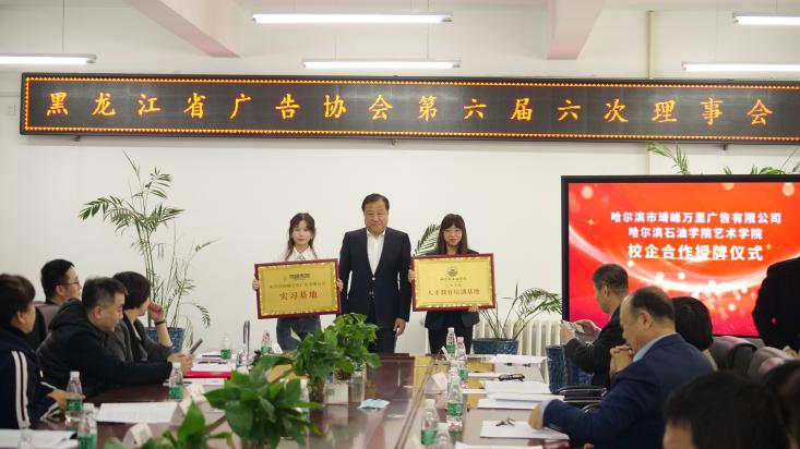 为加强参会企业对艺术学院的了解,艺术学院副院长花瑞洁向各理事会成员介绍了艺术学院的发展现状、教学理念、特色实践教学模式,并在会议中与黑龙江省广告协会、哈尔滨琦峰万里广告有限公司举行人才教育培训基地、实习基地的授牌仪式。会后,省广协理事参观了艺术学院融媒体实验中心及学前教育学院实训室。各大传媒企业代表对艺术学院实验室的建设给予了充分肯定,并表示期待未来通过企业项目缩短学生到企业的最后一公里。