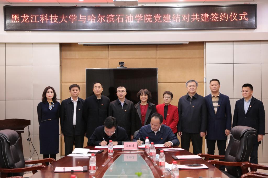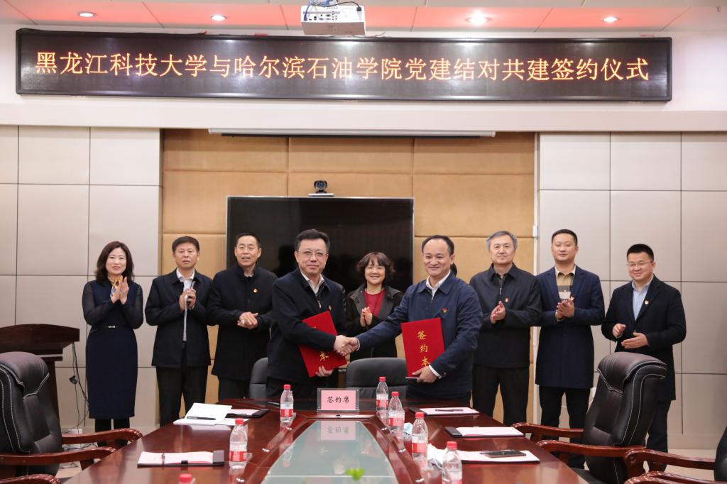 黑龙江科技大学党委书记周宏力与雷竞技raybet官网版下载党委书记林立民代表双方学校签署党建结对共建协议。