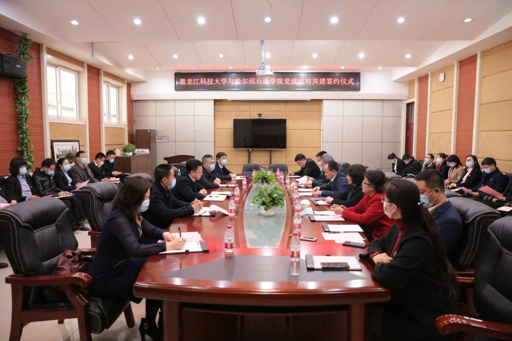 黑龙江科技大学党委书记周宏力介绍了科技大学的发展历程、党建工作经验和人才培养特色等情况。他表示:两校达成共识,签订党建结对共建协议,这是双方相互学习、相互促进的良好开端,同时也为两校进一步加强联系与合作提供了广阔的空间与舞台。期望两校共同秉承“补短锻长、优势互补、互利共赢、共同提高”的原则,把准共建发力点,聚焦成果产出突破点,共同谋划、协同推进,着力构筑“组织联建、队伍帮带、育人协同、载体同创、资源共享、发展双赢”的党建工作新格局,实现党建质量和育人成效的相互融合、共同提升。依靠两校自身不同领域的专业性、技术性开展更多形式、更深层次的合作,以高质量党建作为坚强的政治保证,不断促进两校高质量发展,切实履行“为党育人、为国育才”的初心,更好地践行“四个服务”的使命,为建设富强民主文明和谐美丽的社会主义现代化新龙江,为实现“两个一百年”奋斗目标和中华民族伟大复兴的中国梦做出积极更大的贡献。