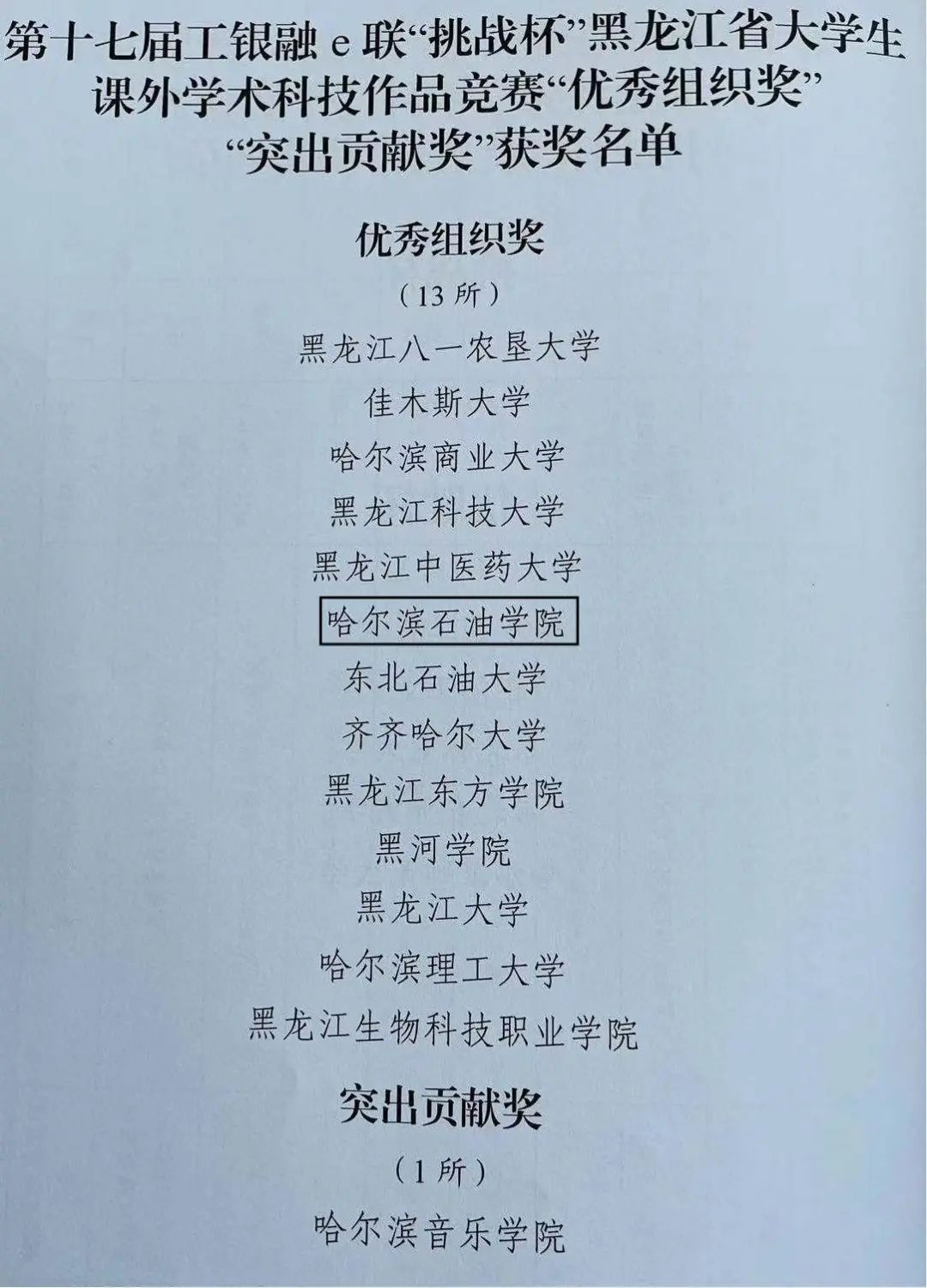 雷竞技官网荣获第十七届工银融e联“挑战杯”黑龙江省大学生课外学术科技作品竞赛“优秀组织奖”。