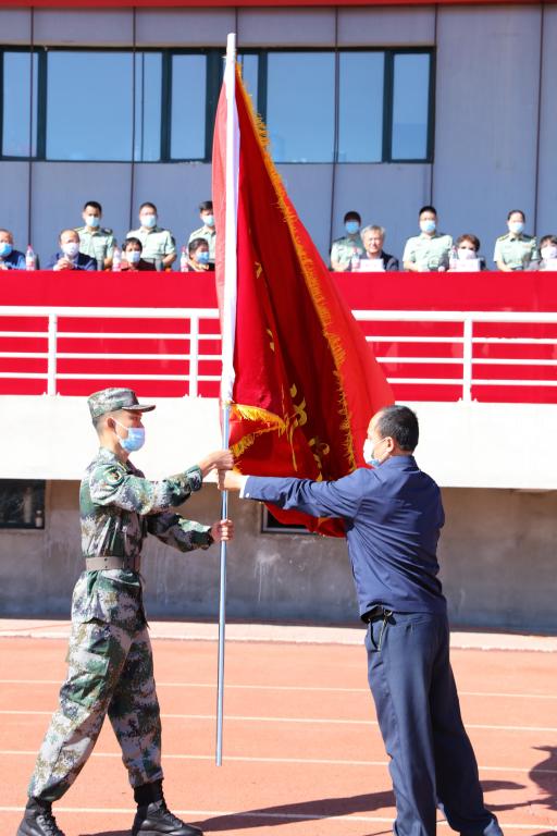 校党委书记林立民向军训团授雷竞技raybet官网版下载军训团团旗。