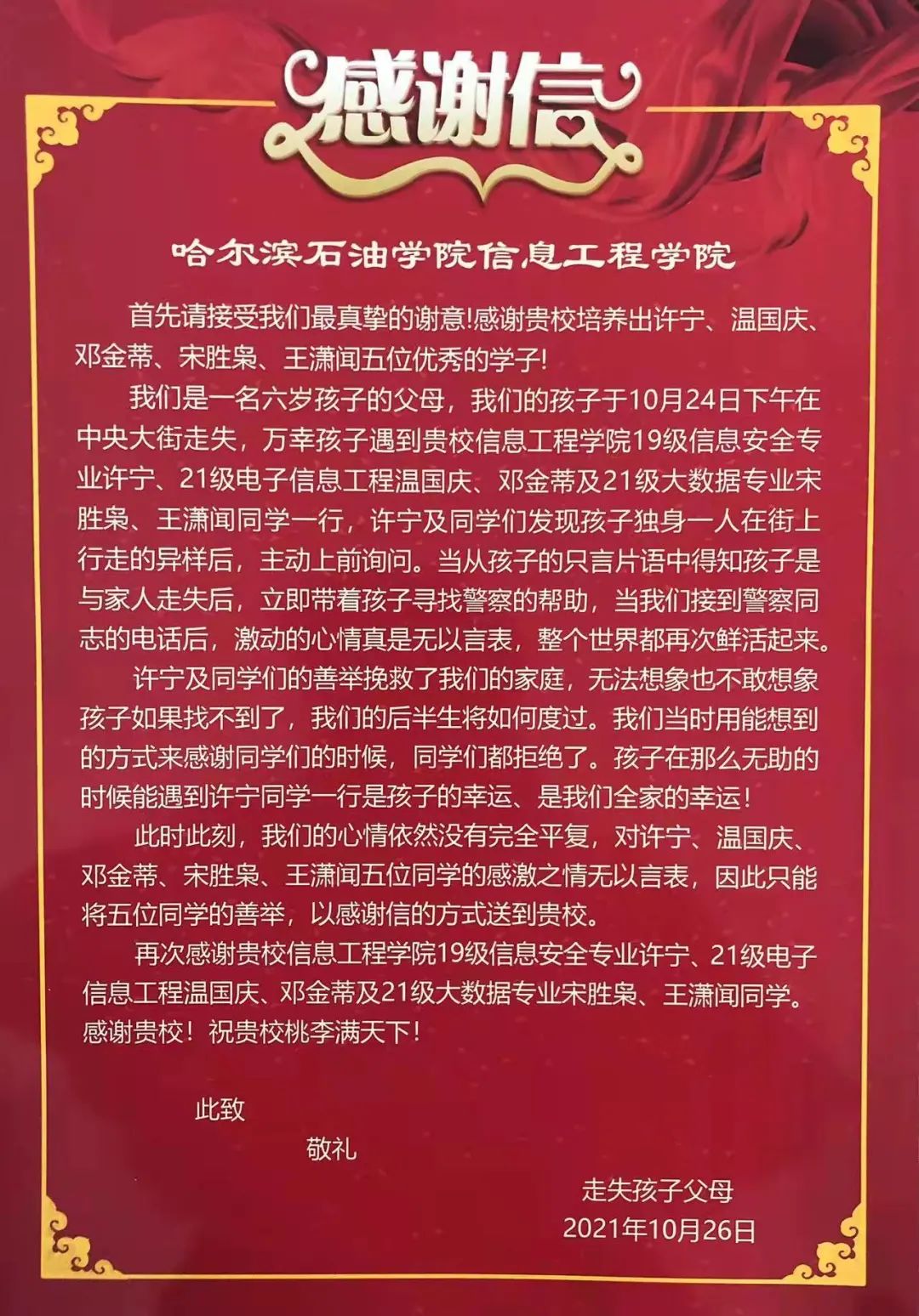 10月24日,雷竞技官网信息工程学院学生许宁、温国庆、邓金蒂、宋胜枭、王潇闻等同学在中央大街遇到了一位独自行走、眼神异样的小孩,出于善意,他们主动上前询问,耐心交流后得知孩子与家长走散了,五位同学一边安抚小孩一边联系当地民警,最终帮助小孩与父母团聚。