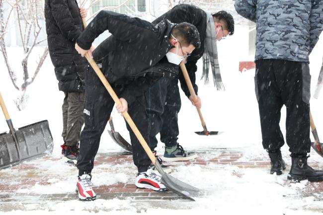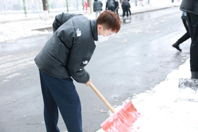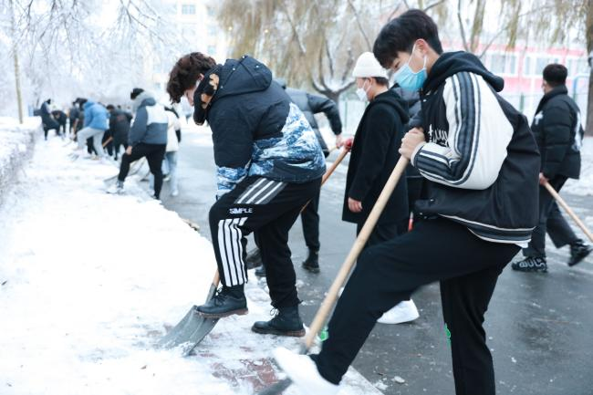 除雪现场,师生们不怕苦不怕累,大家团结协作、互帮互助,手持推雪铲、铁锹等工具,有序地清理道路积雪、铲除路面结冰。师生们热火朝天地忙碌着,用火热的情怀为冬日的哈油校园增添了一股暖流,为全校师生的安全出行提供了保障,将“我为群众办实事”实践活动落到实处,把党史学习教育成果转化为服务师生群众的生动实践。