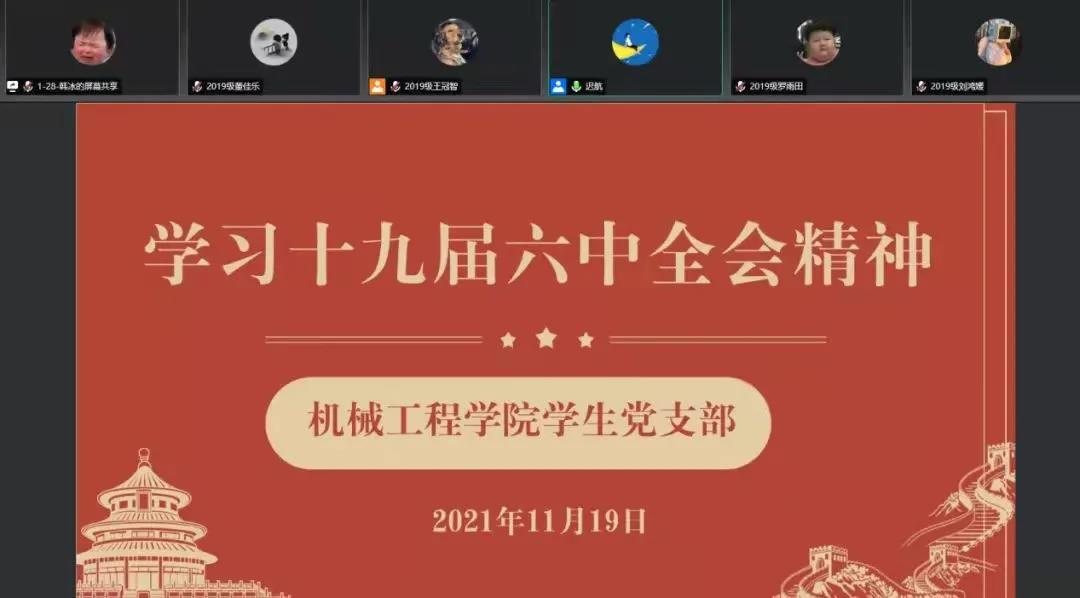 11月19日,机械工程学院学生党支部线上集中学习了党的十九届六中全会精神。通过此次集中学习,同志们纷纷表示要坚定理想信念,牢记初心使命,努力练就过硬本领,以奋斗放飞青春梦想,为实现第二个百年奋斗目标、实现中华民族伟大复兴的中国梦贡献青春力量。