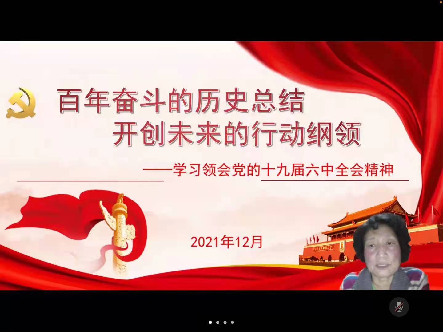 12月15日19时,学校共同课党总支书记宋玉玲深入机关党总支线上宣讲党的十九届六中全会精神,宣讲会由机关党总支书记陈旭辉主持,共60余人参与学习,为党总支书记交叉宣讲打好头阵。宋书记以《百年奋斗的历史总结,开创未来的行动纲领》为题,从“如何学习”、“理论创新”、“大历史观”等三个方面进行了宣讲。宣讲会上,宋书记紧紧围绕全会审议通过的《中共中央关于党的百年奋斗重大成就和历史经验的决议》,用深入浅出、振奋人心、通俗易懂的话语启发党员干部的共鸣,对党的十九届六中全会精神进行了深刻的阐释解读和扎实的宣讲辅导。