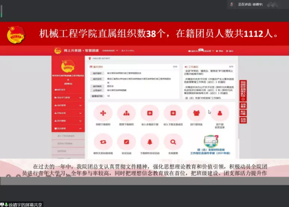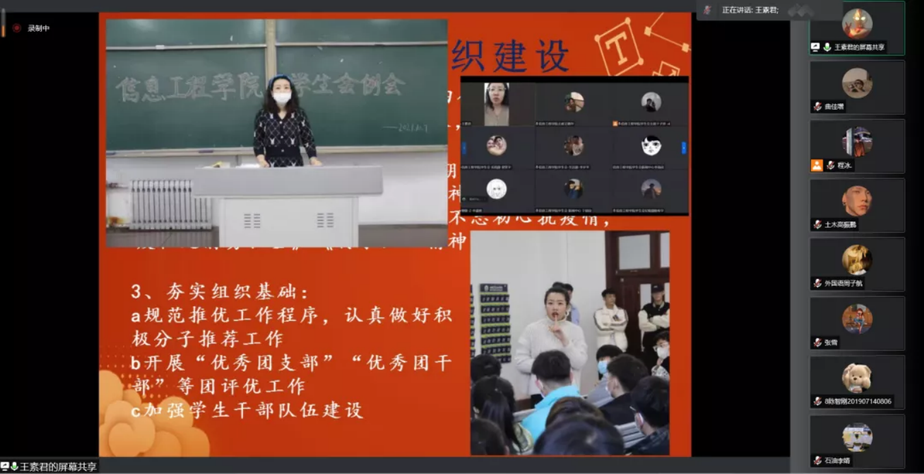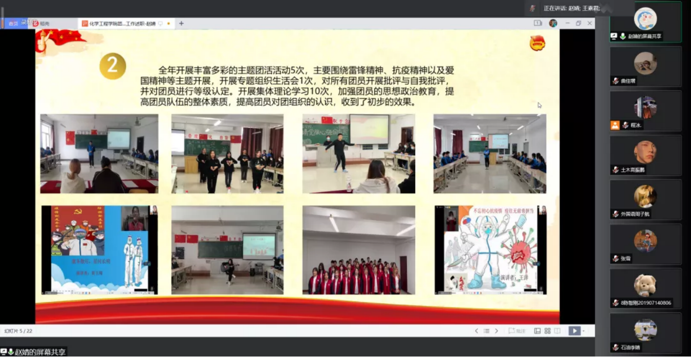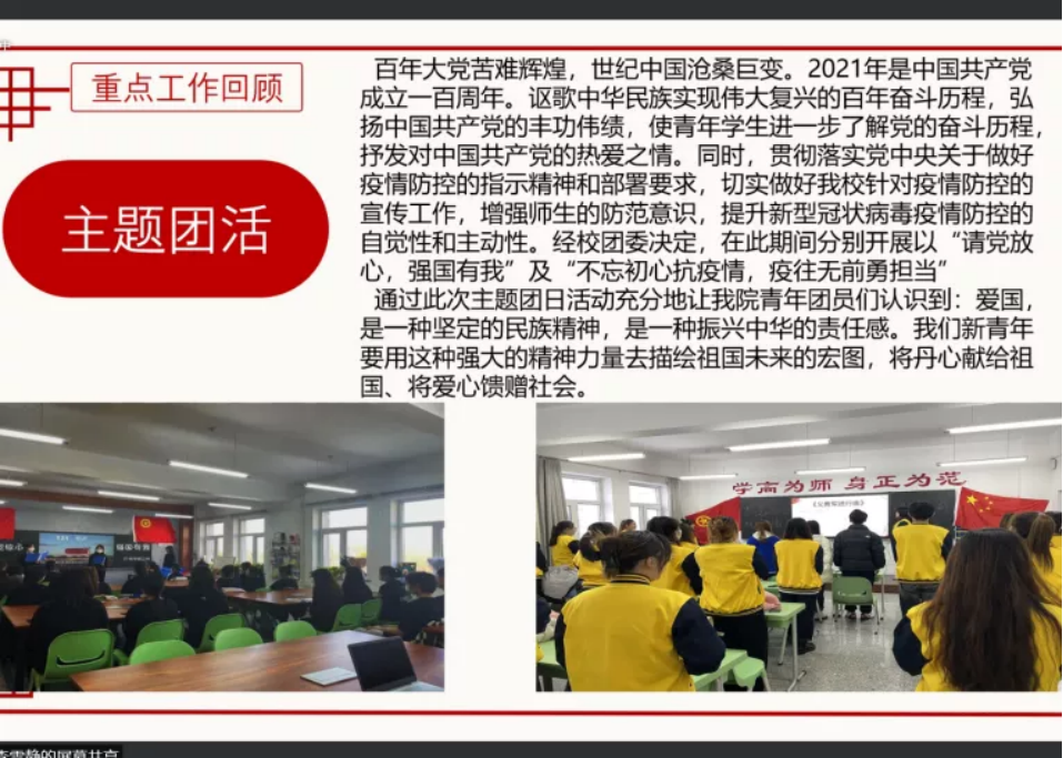 为深入贯彻落实习近平总书记关于青年工作的重要思想,进一步加强共青团基层组织的建设,增强基层团组织活力,2022年1月7日下午13点校团委召开2021年度基层团总支述书记职评议会,校团委书记王锦石、副书记彭雷、组宣部部长冯海龙、干事吕家妮、各学院团总支书记及学生代表参共计35人参会,会议由校团委书记王锦石主持。
