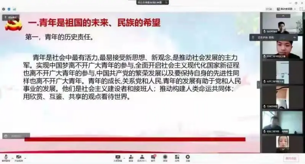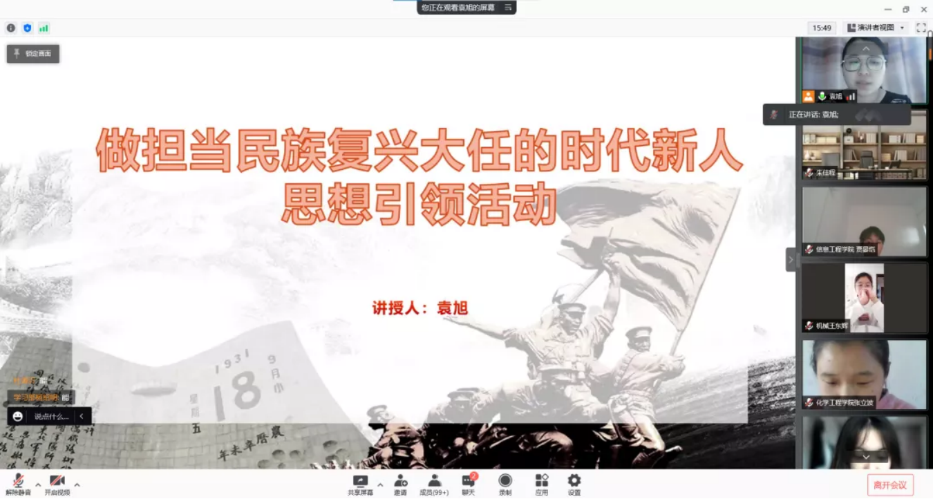 袁旭老师围绕:青年是祖国的未来、民族的希望;新时代青年要有理想、有本领、有担当;新时代青年要在实践中学真知、悟真谛;中华民族伟大复兴终将在广大青年的接力奋斗中变为现实等四方面内容进行阐述。袁旭老师提到,实现伟大复兴的中国梦和全面开启社会主义现代化国家新征程都离不开青年人的参与,中国共产党的繁荣发展同样也离不开青年人,我们任重而道远。最后袁旭老师还勉励各位学生干部,说到:我们生逢其时,见证了祖国的繁荣发展,但同时也重任在肩,在今后的学习、生活、工作中,要不断努力,为实现中国梦而奋进!