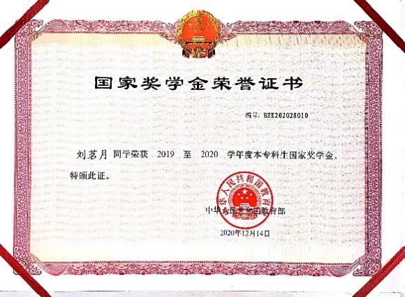 平日里,她认真学习专业课程,注重拓宽自己的专业知识,优化自己的知识结构,培养自己的学习思维。学习认真,勤奋刻苦,锐意进取,经常反思和总结自己。书山有路勤为径,学海无涯苦作舟,这种信念让她坚持往前。两年来,她的成绩一直排名专业第一,并荣获了2019-2020学年度国家奖学金、2020-2021学年度国家奖学金、2019-2020学年度校一等奖学金,2020-2021学年度校二等奖学金并取得了2019-2020学年度校“三好学生标兵”等荣誉称号。