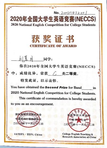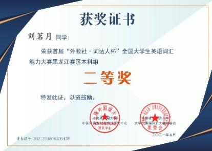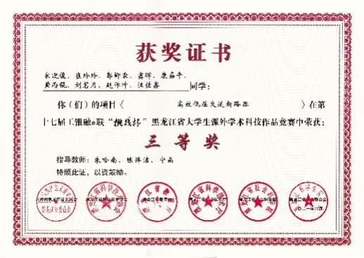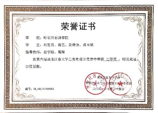 学习之余,她积极参加学科竞赛,拓展其他学科的知识和能力,最让她印象深刻的就是准备大学生创新创业项目,他们从一开始遨游书海的迷惘,不知从何下手的局促,到昼夜不分的辛苦,再到设备调试成功的喜悦。在此期间,不论身体多么疲惫,她都没有丝毫想要放弃的念头,功夫不负有心人,经过团队及指导教师的共同努力,他们的大创项目获得了国家级立项,同时在自己不懈努力下,她还获得“2020年全国大学生英语竞赛C类二等奖”、“外教社词达人”全国大学生英语词汇能力大赛黑龙江赛区本科组二等奖”、“第十七届工银融挑战杯黑龙江省大学生课外学术科技作品三等奖”、“第六届黑龙江省大学生光电设计竞赛二等奖”等奖项。