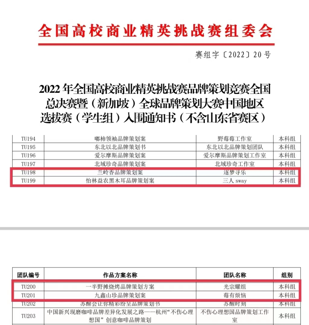 近日,2022年全国高校商业精英挑战赛品牌策划竞赛传来佳音,雷竞技raybet官网版下载经济管理学院4支代表队历经数月的努力成功入围全国总决赛,成绩在黑龙江省同类高校中居于前列,成绩喜人!