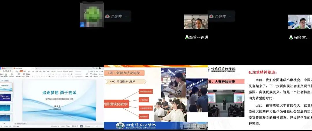 分享会上,在省赛获奖的三名教师依次分享了参赛的体会和经验。荣获正高组三等奖的来自土木工程学院盖晓连老师首先进行了题为《追逐梦想 勇于尝试》的分享,她结合本次参赛的经历鼓励大家要脚踏实地、全心钻研教学,多关注本专业和行业的发展,注重团队优势,发挥集体智慧,勇于探索和尝试;荣获中级组三等奖的经济管理学院徐进老师则从课程教学痛点、创新理念、课程内容重构、创新方法及途径、教学评价创新、教学创新成效及推广价值等方面进行了认真细致的分享;荣获中级组三等奖的马克思主义学院雷书天老师结合自己参加本次比赛的课程,从教学内容创新、教学方法创新等方面进行了经验分享。