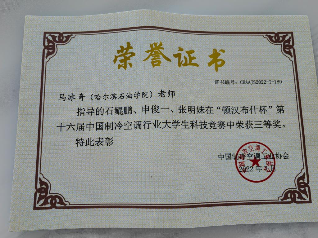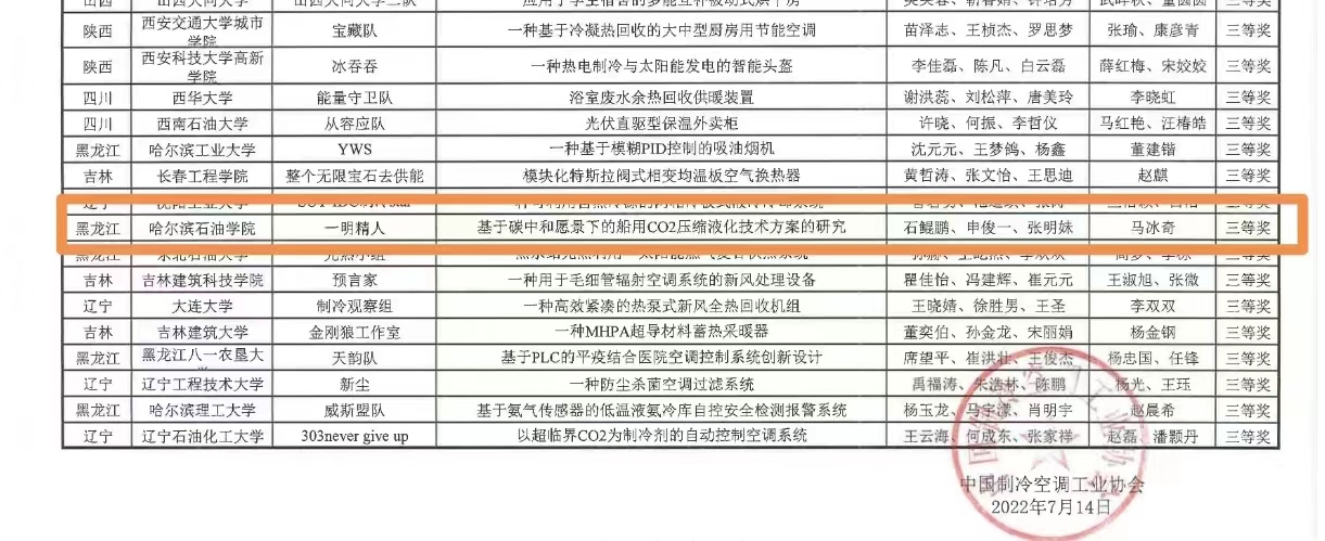依据本次竞赛“自然和谐的制冷空调技术”的创新设计主题,在雷竞技官网土木工程学院马冰奇老师指导下,建筑环境与能源应用工程专业2019级本科生石鲲鹏、申俊一、张明妹三位同学的参赛作品《基于碳中和愿景下船用CO2压缩液化方案的研究》,经过初赛选拔和复赛推荐,顺利晋级决赛,并荣获大赛本科生组三等奖。