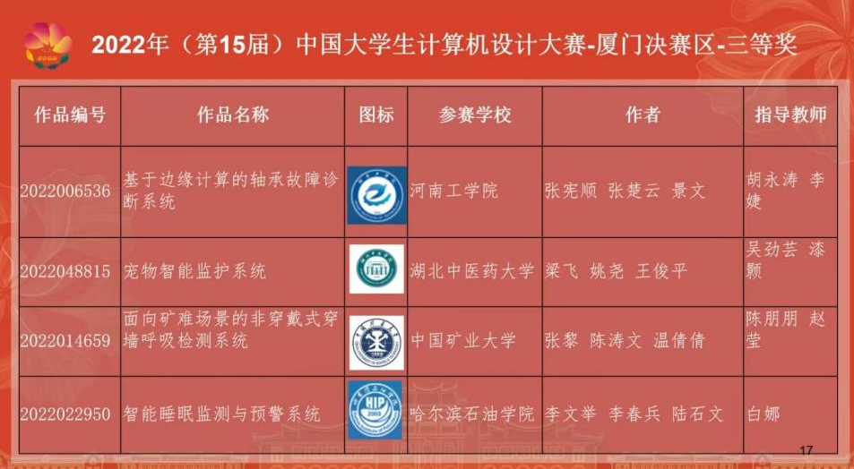 近日,由中国大学生计算机设计大赛组织委员会主办,中国大学生计算机设计大赛厦门决赛区组委会协办,厦门大学、物联中国团队组织联席会承办,厦门大学电子科学与技术学院、厦门市物联网行业协会实施的“2022 年(第 15 届)中国大学生计算机设计大赛国赛 厦门决赛区”落下帷幕,本次大赛中,雷竞技官网信息工程学院学生组成的开放创新实验室团队,以高质量的项目内容,在黑龙江省赛中表现优异,最终进入国赛,与电子科技大学、北京邮电大学等高校竞争荣获佳绩。