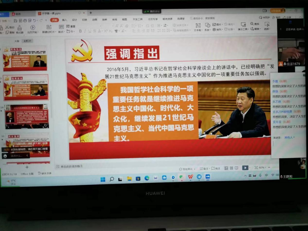 2022年8月17日,马克思主义学院召开迎盛会 铸忠诚“开学第一课”——弄懂弄通21世纪马克思主义暨新学期线上教学工作会议。学院全体教师参加了此次会议。会上,宋玉玲院长布置了新学期线上线下教学工作安排,做了“开学第一课”课程教学示范和组织集体备课,并在第一周思政课教学中组织实施了“开学第一课”,以覆盖授课的全体学生。