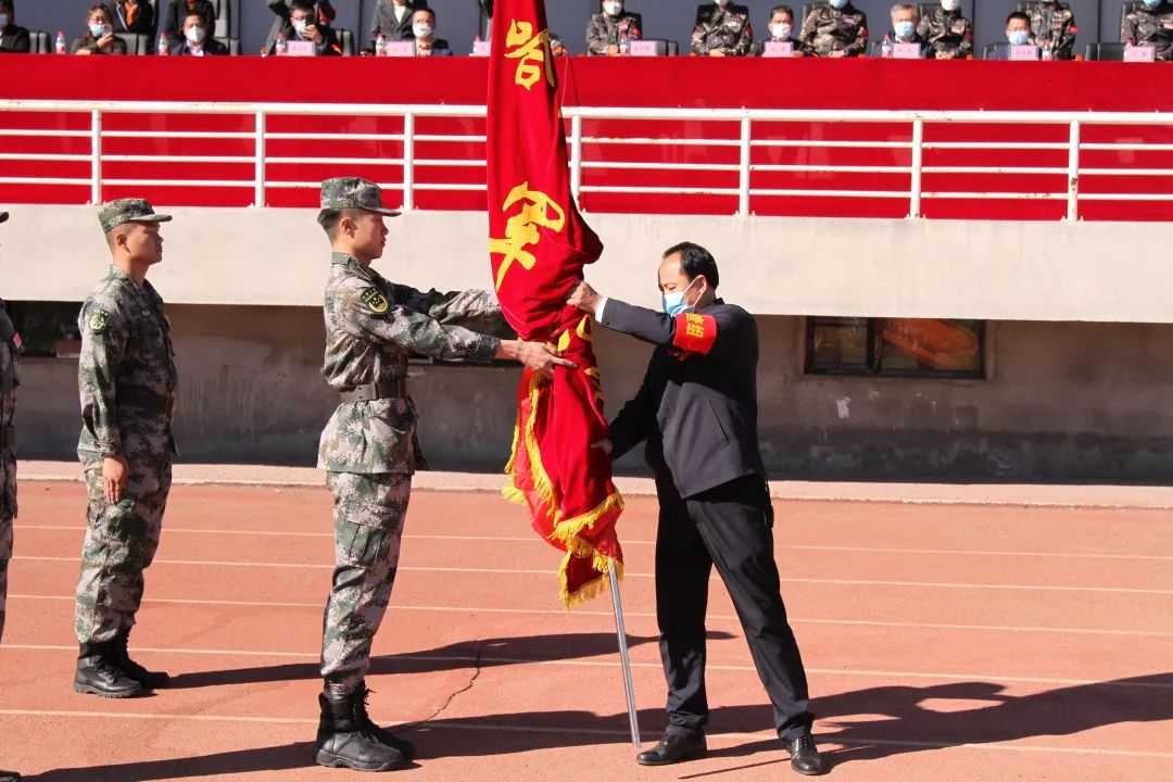 校党委书记林立民向军训团授雷竞技raybet官网版下载军训团团旗。