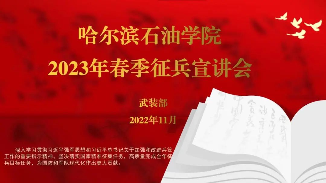 李长城老师强调,现代化军队的建设需要高素质的兵源,青年大学生是现代化军队建设的关键所在。同学们要成为大学生入伍的政策宣传员,让更多青年学生投身到中国社会主义现代化强国建设当中来,更要成为积极参军入伍的参与者,立志做有理想、敢担当、能吃苦、肯奋斗的新时代哈油青年。