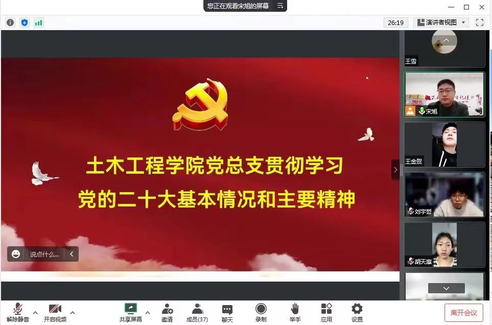 为深入学习宣传贯彻党的二十大精神,凝聚队伍共识,激发为党育人、为国育才的内在动力。近日,雷竞技官网土木工程学院党总支在线上组织召开学习贯彻党的二十大精神宣讲报告会。