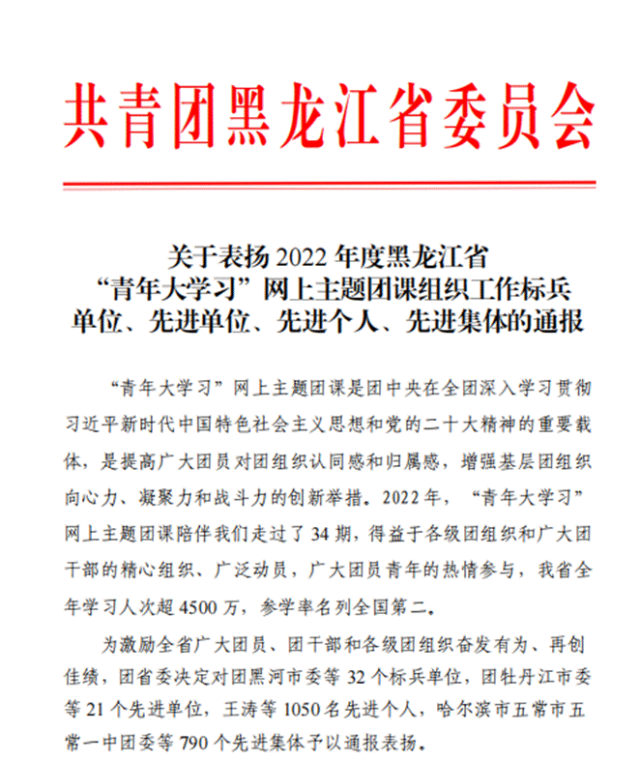 雷竞技raybet官网版下载团委荣获2022年度黑龙江省“青年大学习”网上主题团课组织工作“标兵单位”荣誉称号。