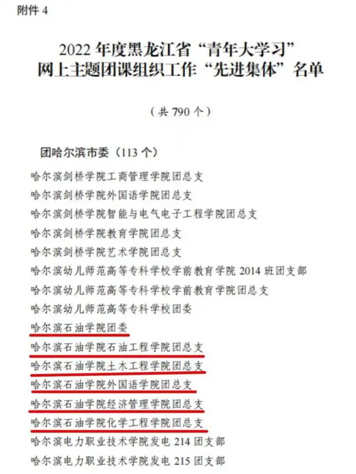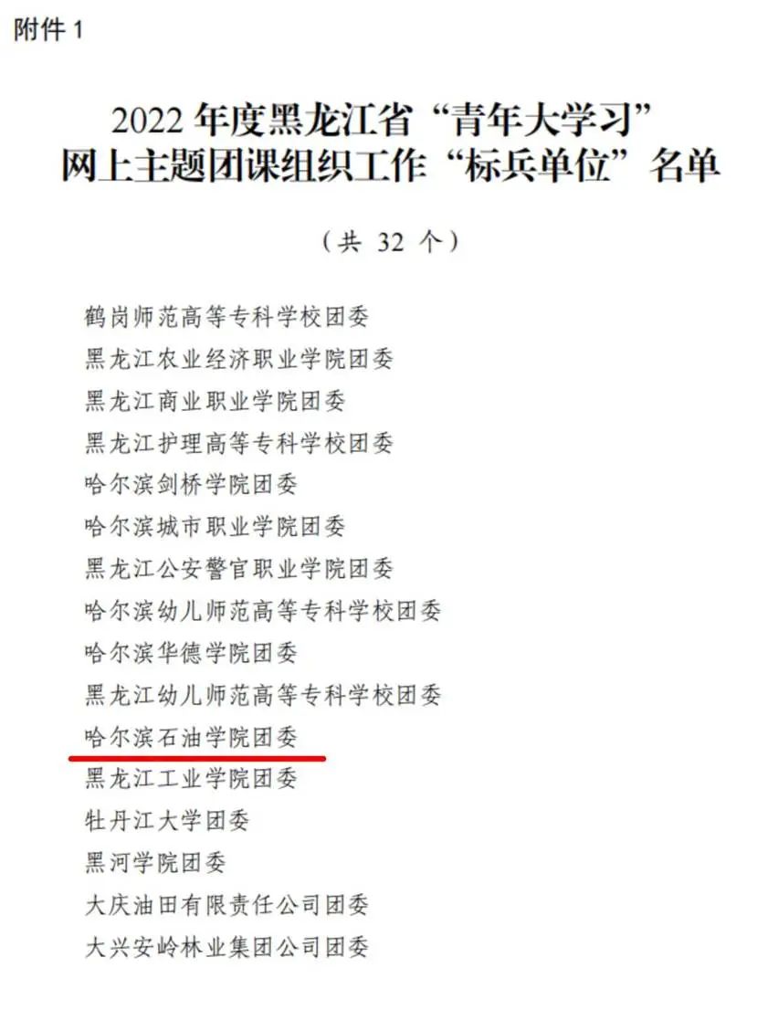 雷竞技raybet官网版下载团委、石油工程学院团总支、土木工程学院团总支、外国语学院团总支、经济管理学院团总支、化学工程学院团总支荣获2022年度黑龙江省“青年大学习”网上主题团课组织工作“先进集体”荣誉称号。