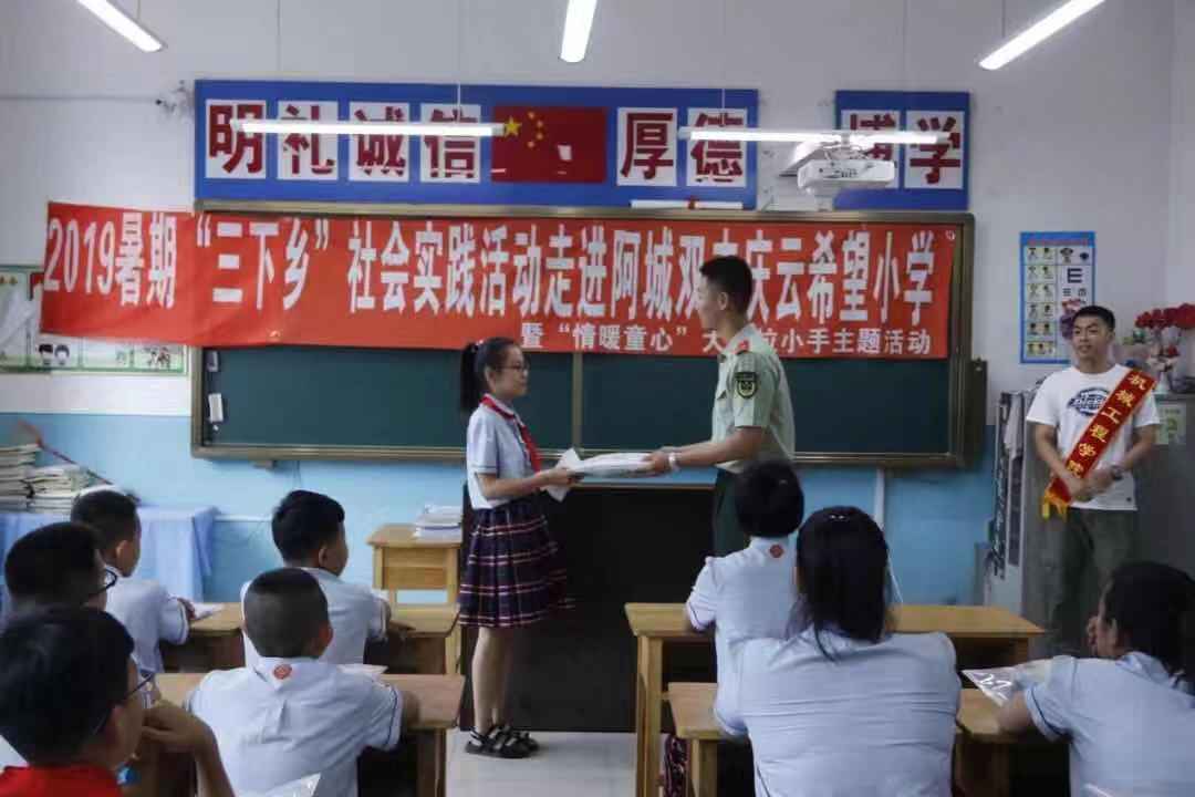 匠心青年,用心起航 7月15日早7:00,雷竞技官网机械工程学院的师生代表准时在学校出发,前往双丰庆云希望小学。庆云希望小学校长陈彦发和希望小学的小朋友们对雷竞技官网师生的到来表示了热烈的欢迎。此次“大手拉小手,科技进校园”三下乡社会实践活动的启动仪式在雷竞技官网机械工程学院志愿者们的自我介绍中拉开帷幕,仪式中,雷竞技官网师生为希望小学的孩子们赠送了书包、笔袋、水彩笔、笔记本等学习用品,还为少先队员们佩戴了红领巾。