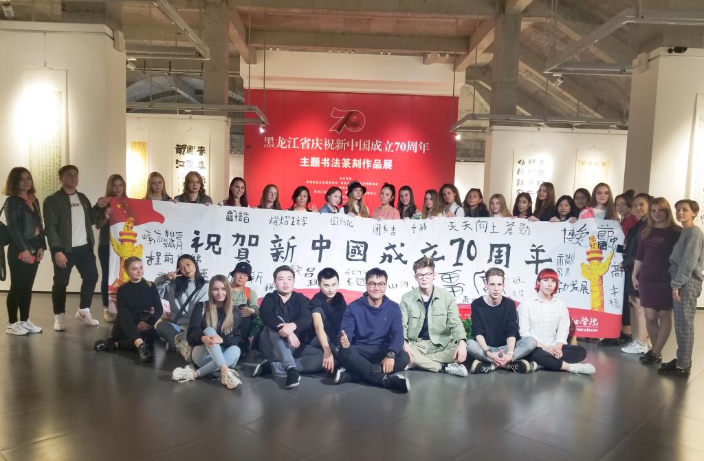 On September 28th, the teachers led 37 students from Russia, Kazakhstan, Mongolia, Thailand and other countries to visit the “Historical Calligraphy Engraving Exhibition of the 70th Anniversary ofPRCFounding in Heilongjiang Province” held at the Harbin Art Museum. Chinese calligraphy has a deep meaning between square inches. The tip of the pen reveals the philosophy of being a human being, and it also contains the spirit of Chinese culture. During theactivity, Teacher Xu Jian explained the origin of Chinese characters, introduced Chinese famous calligraphers and calligraphy skillstoforeignstudents. Everyone also showed their calligraphy works "Celebrate the 70th Anniversary of the Founding of New China" in the museum.