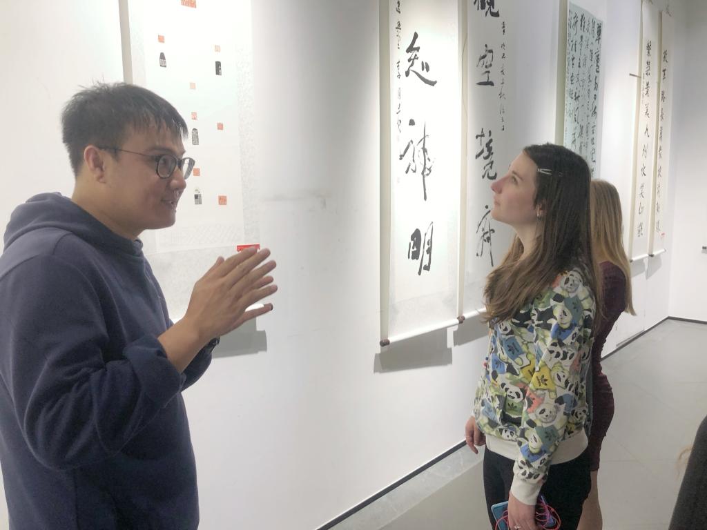 9月28日,老师们又带领俄罗斯、哈萨克斯坦、蒙古、泰国等国留学生37人,参观了在哈尔滨美术馆举行的“黑龙江省庆祝新中国成立70周年主题书法篆刻作品展”。中国书法在方寸之间有深意,笔尖流露出为人处世的哲学,也蕴含着中国文化的精神。活动中,徐健老师为留学生们解释中国汉字起源、介绍中国著名书法家并讲解书法技巧。大家还把自己书写的“祝贺新中国成立70周年”的书法作品在美术馆展示。