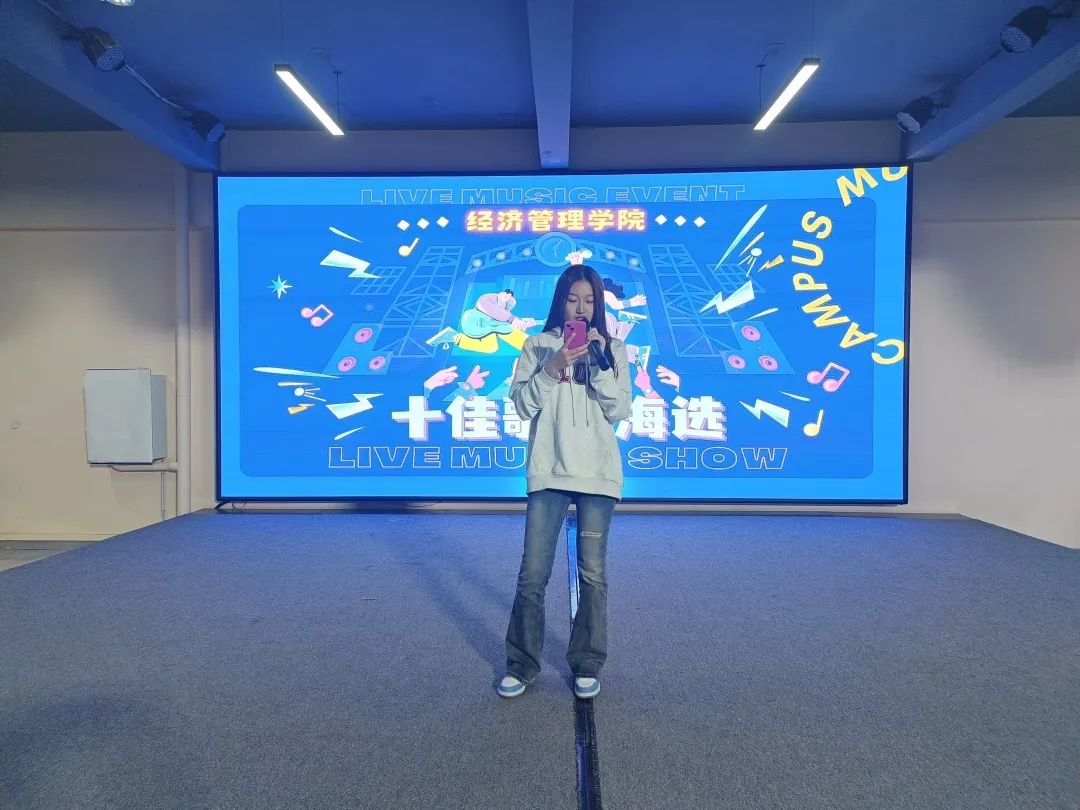 一首《多想在平庸的生活里抱住你》,打开了我们沉睡的回忆,人生在世,我们应努力生活,珍惜眼前。随着舒缓的伴奏,董光莹同学为我们带来了一首邓丽君的《我只在乎你》,空灵的声音,美妙的韵律,深情的演绎打动了在场的每一位观众。紧接着舞台画风一转,一首《给我一个理由忘记》,将同学们拉进了回忆的漩涡,选手用细腻的声音表达出了对美好过去的珍惜与留恋。参赛选手都选择了自己的拿手歌曲,一展歌喉。经过层层比拼,其中十名同学突破重围成功晋级,即将代表我院参加校园十佳歌手比赛。