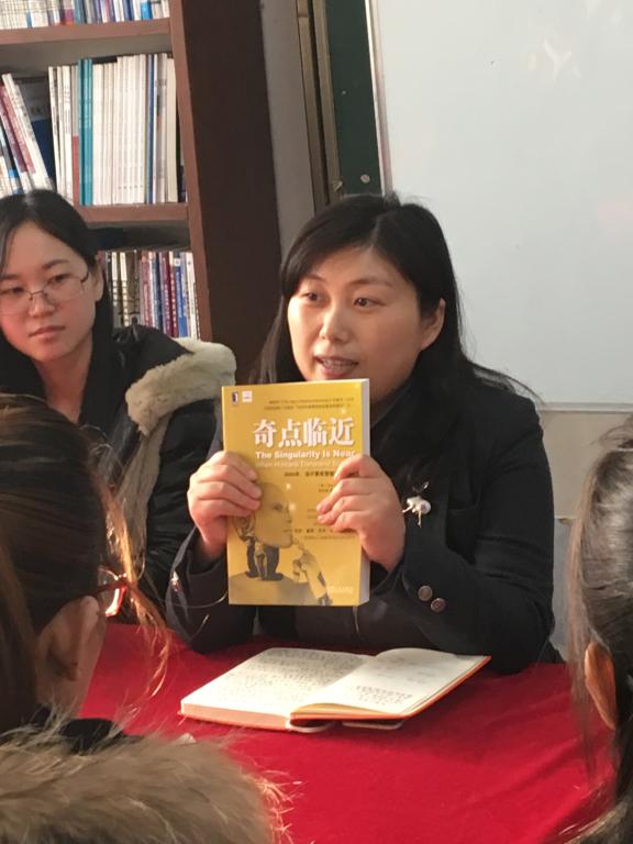首先,王院长向教师们推荐了关于人工智能的书籍《奇点临近》,王院长表示:人工智能作为21世纪科技发展的最新成就,这本书深刻揭示了科技发展为人类社会带来的巨大影响。《奇点临近》结合求解智能问题的数据结构以及实现的算法,把人工智能的应用程序应用于实际环境中,并从社会和哲学、心理学以及神经生理学角度对人工智能进行了独特的讨论,提供了一个崭新的视角,展示了以人工智能为代表的科技现象作为一种“奇点”思潮,揭示了其在世界范围内所产生的广泛影响,这本书非常适合从事机械类很专业的高校教师阅读。