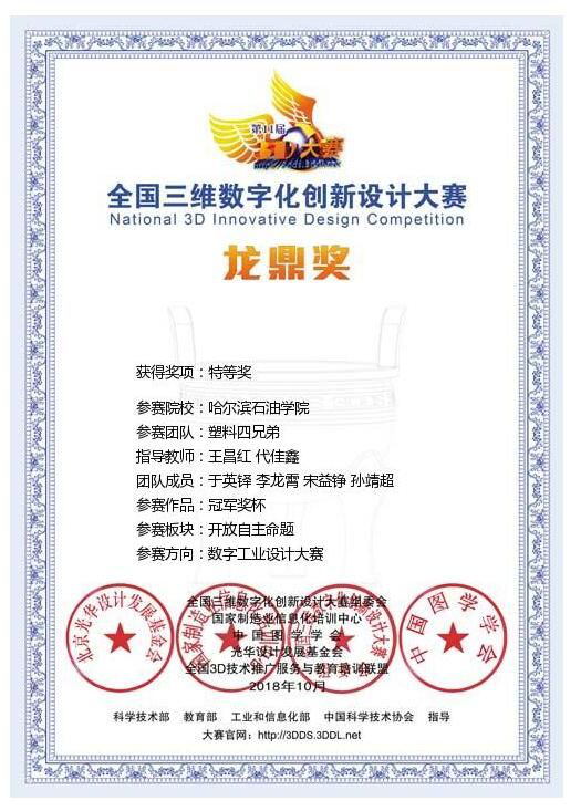 全国3D大赛是国家大力推进创新驱动、实现从“制造大国”到“创造大国”转变、大力发展互联网+和数字经济新时代开展的一项大型公益赛事,体现了科技进步和产业升级的要求,是大众创业、万众创新的具体实践。在本次全国3D大赛中哈尔滨工业大学、黑龙江大学、哈尔滨工程大学等省内多所高等本科院校也积极参赛,“塑料四兄弟”团队参赛此次比赛,与高等本科院校同台竞技,并获得特等奖殊荣。