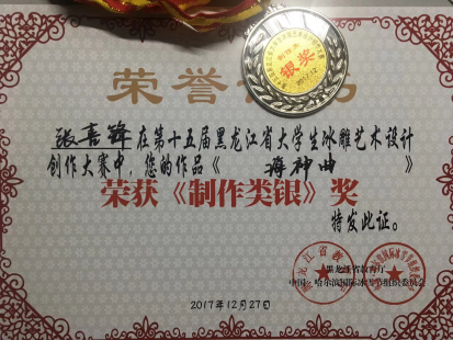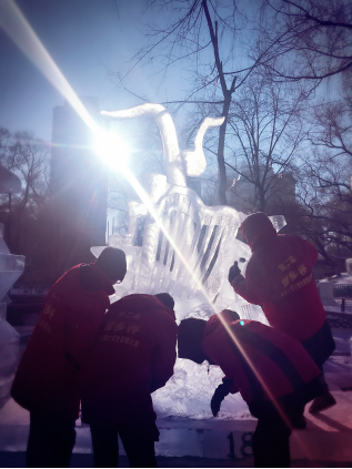 最后经过激烈的角逐,比赛于12月27日落下帷幕,机械工程学院高鹏、王悦、杜昌瑞、王志杰、张喜锋5名学生在李佳阳老师的指导下齐心协力雕刻了《海神曲》冰雕作品,最终斩获了制作类银奖,评委给予了高度肯定。