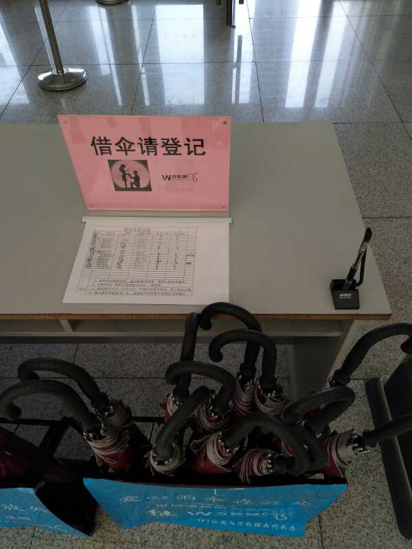 校FTF社团联合“万能猫”掌上服务平台在图书馆出口处设置爱心雨伞存放处,为同学们雨天出行提供便利,需要爱心雨伞的同学可登记使用。