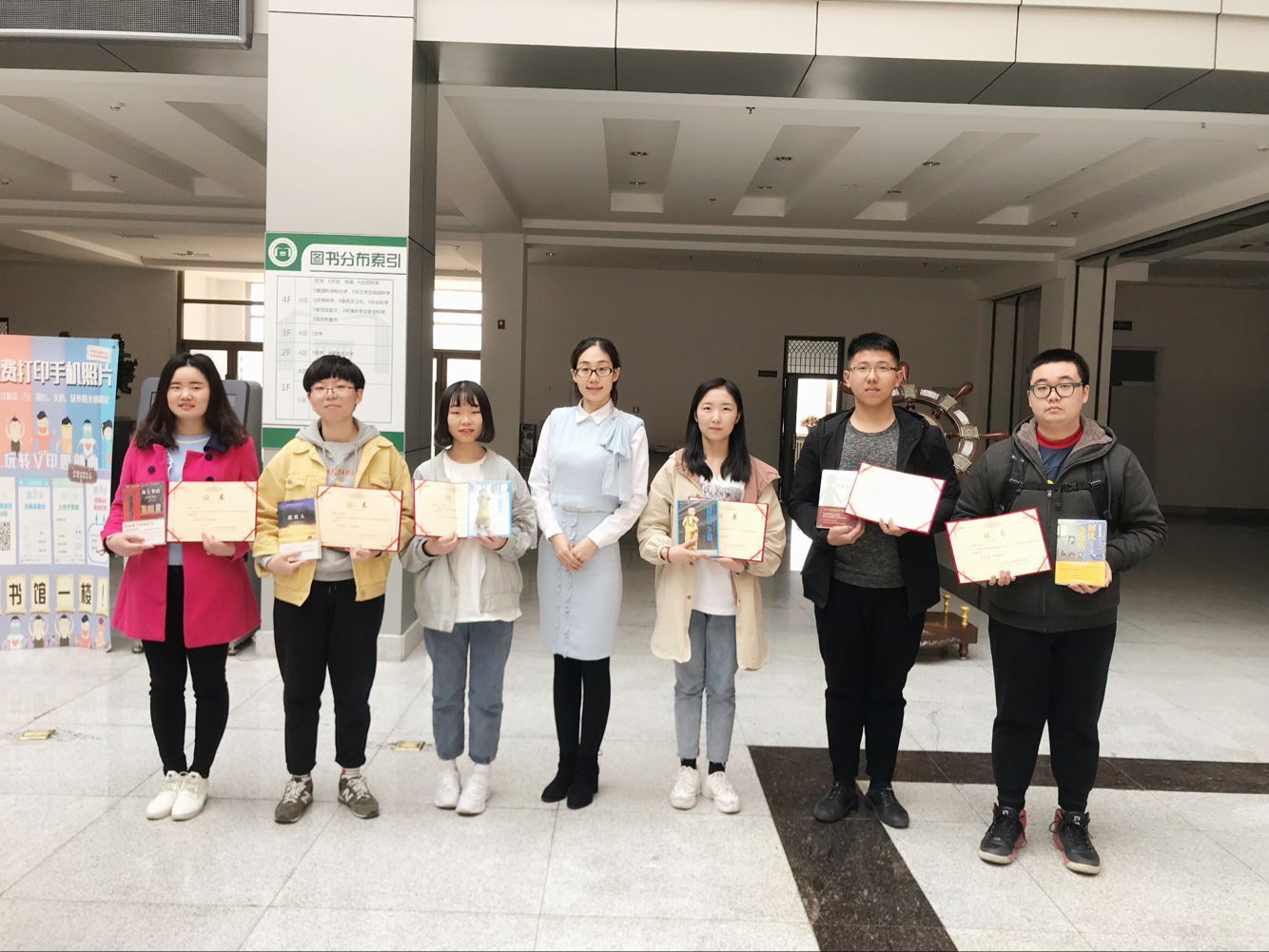 图书馆评选出2017年度优秀学生助理馆员,本次评选出的7名同学作为优秀学生助理馆员的代表,在课余时间协助馆员老师进行阅览区卫生清理及桌椅整理工作。图书馆孙静娜老师为他们颁发了荣誉证书及奖品,对他们的辛勤工作表示感谢并合影留念。