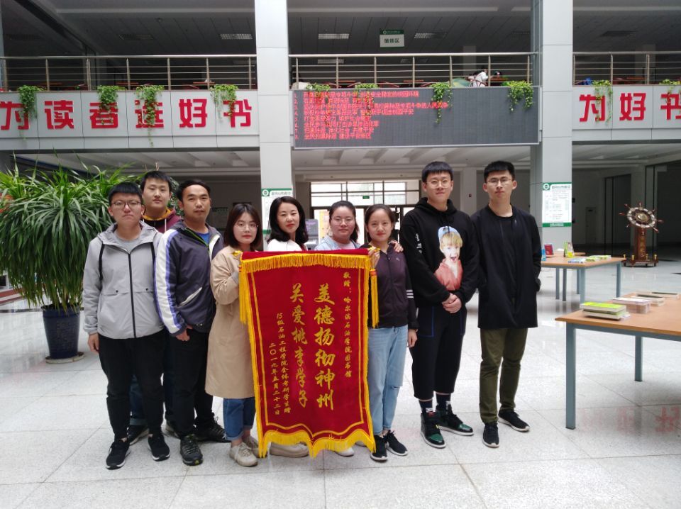 5月23日下午,2019届石油工程学院考取研究生的学生代表将一面写有“关爱桃李学子 美德扬彻神州”的锦旗赠送给图书馆,表达对图书馆工作的谢意。