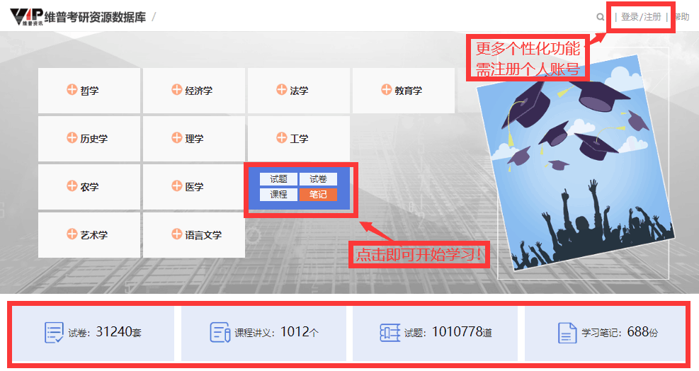 为了方便广大考生们宅在家里也能安心备考,维普资讯为雷竞技官网考生免费提供考研全过程复习资料,包括课程讲义、学习笔记、各高校复试试卷等等。