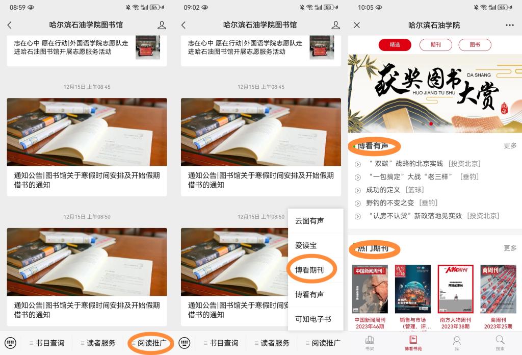 打开雷竞技raybet官网版下载图书馆微信公众号—菜单栏—博看期刊,进入主页面就可以看到期刊、读书、有声读物等分类