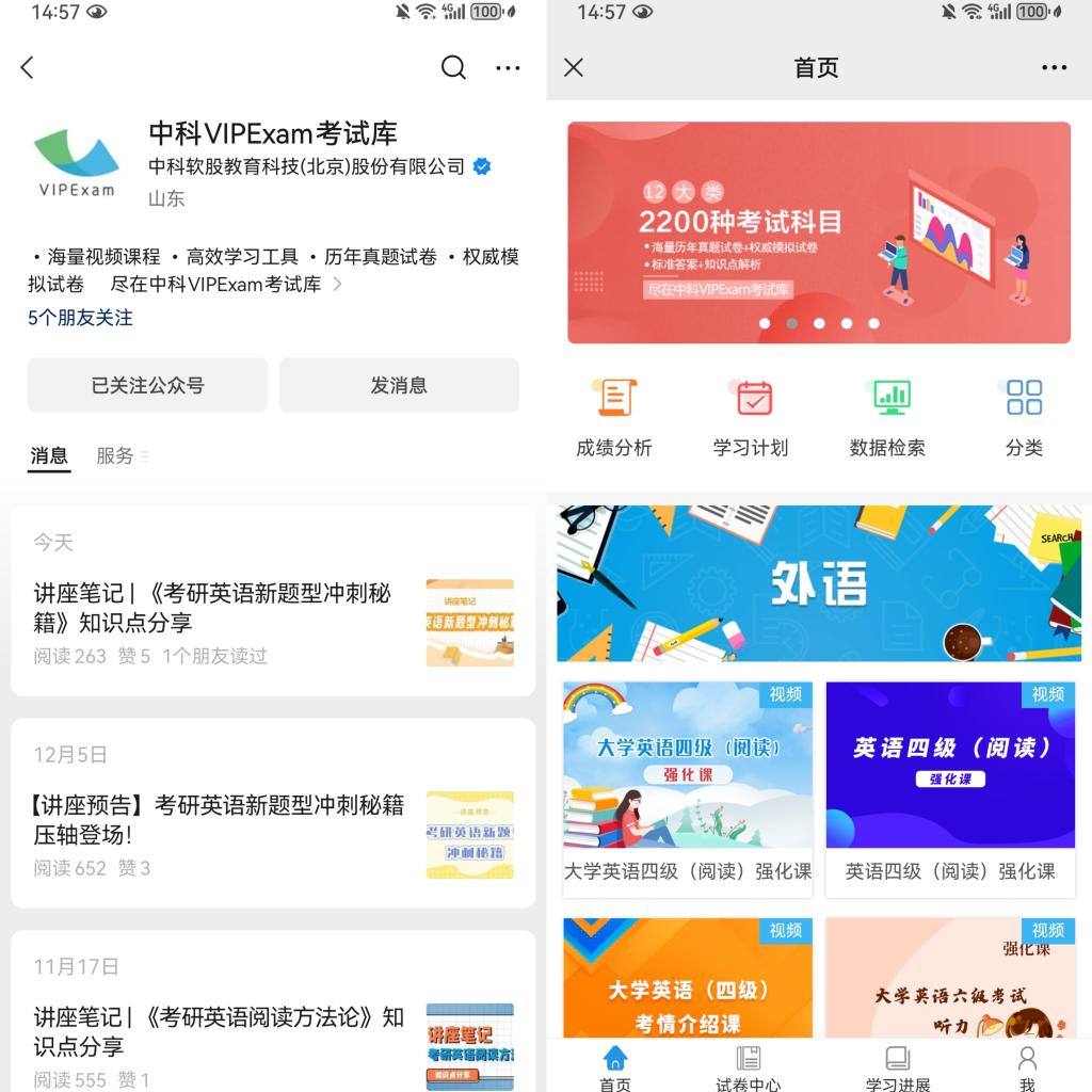 关注官方微信公众号(搜索:中科VIPExam考试库),进入菜单栏登录账户,使用数据库学习资源。